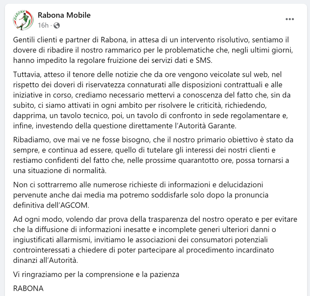L’ultimo messaggio sulla pagina Facebook di Rabona Mobile, datato 18 aprile 2023, è il seguente: