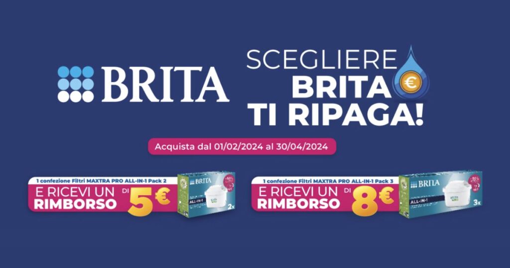 In sintesi, una volta acquistata una delle due confezione di filtri Brita in promozione, puoi ottenere un rimborso pari a 5€ o 8€ effettuando la richiesta sul sito ufficiale dedicato all’iniziativa.