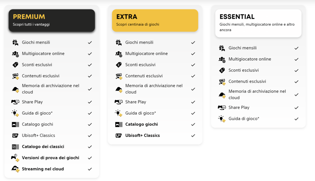 L’ultimo piano comprende tutti i vantaggi dei precedenti, ma alza l’asticella con altre novità come l’accesso ad un catalogo intero di grandi classici PS1, PS2 e PSP, ma anche la possibilità di giocare in streaming cloud ai giochi PS1, PS2, PSP e PS4 del PlayStation Now.