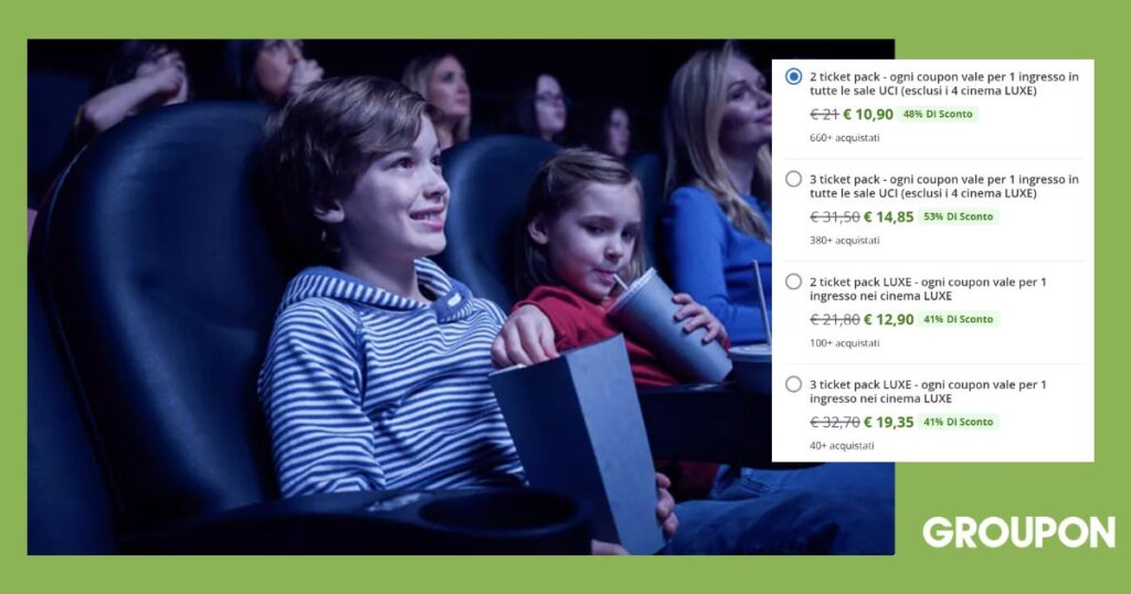 Tramite l’offerta su Groupon, i biglietti dell’UCI Cinema sono in offerta con sconti dal 41% al 53%: a seconda di quanti biglietti acquisti infatti puoi pagare da 10,90€ a biglietto, fino a 19,35€. In media 5€ a biglietto!