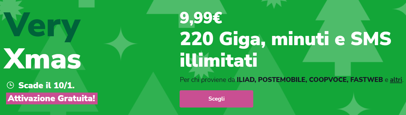 Offerta BOMBA di Very Mobile che propone Very XMAS, la nuova offerta di Natale che farà vacillare tantissimi utenti di altri operatori mobili: ben 220 Giga a soli 9,90€ al mese!