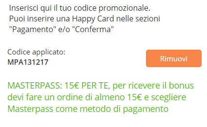 La promozione è valida solo per chi effettua il primo acquisto tramite Masterpass ed è attivo sino al 9 Gennaio 2018.