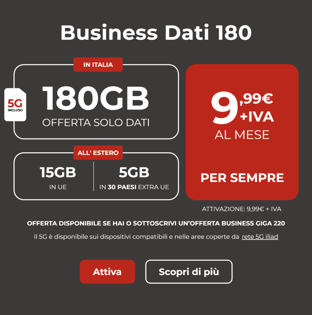 Iliad ha previsto un’ulteriore tariffa dedicata però solo a chi sottoscrive o ha già sottoscritto Business Giga 220. Si tratta si Business Dati 180, un’offerta solo dati, per tablet o per l’utilizzo in hotspot mobile, che include: