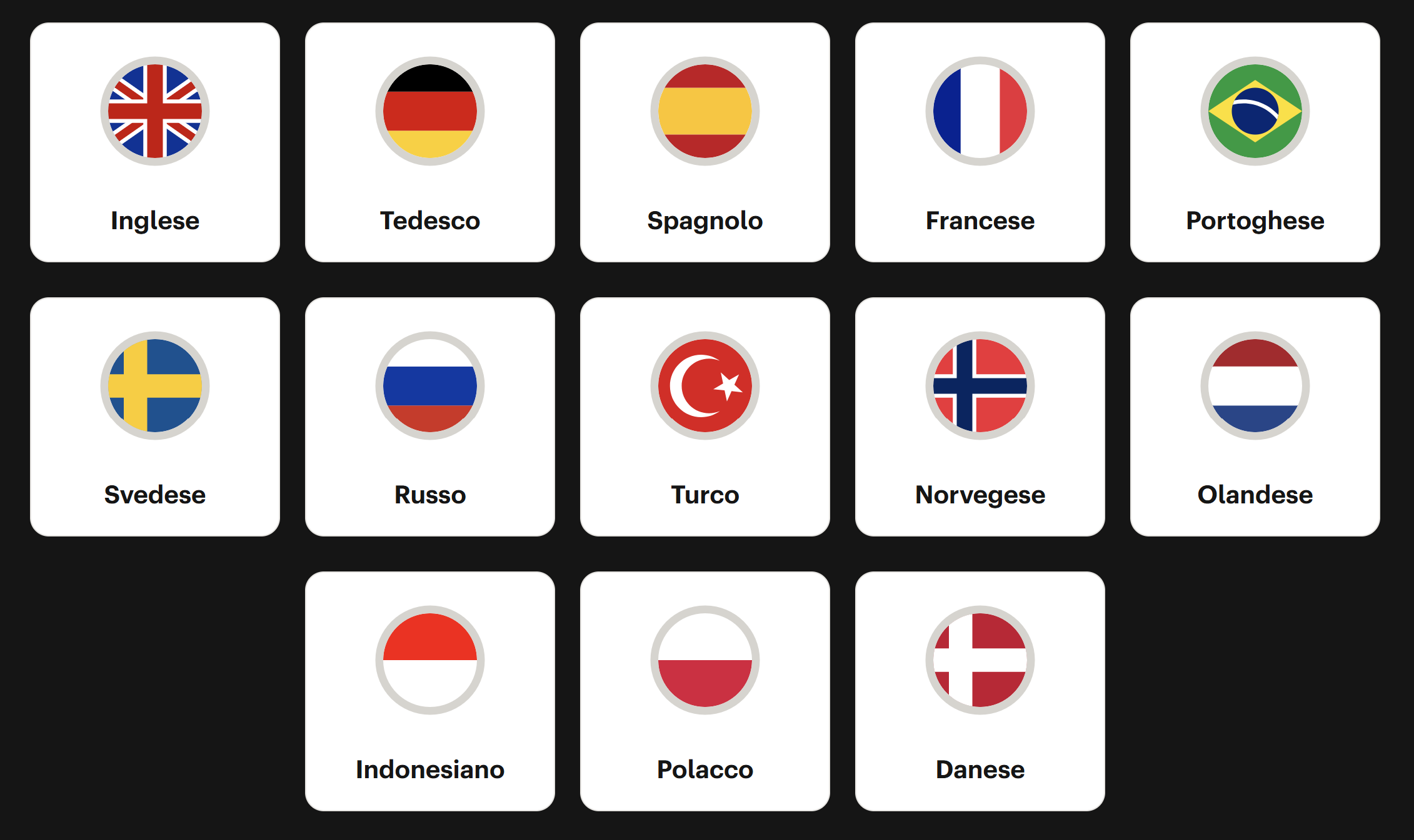 Con tutti i piani di abbonamento in offerta potrai spaziare tra ben 13 lingue: Inglese, Spagnolo, Francese, Tedesco, Portoghese, Svedese, Turco, Olandese, Polacco, Danese, Norvegese, Indonesiano e Russo.
