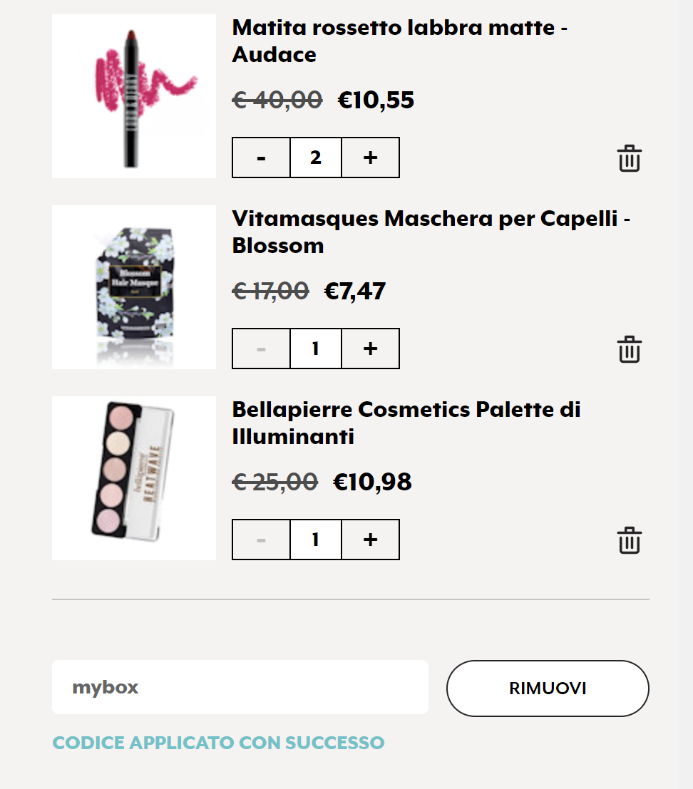 Una volta terminata la spesa, accedi cliccando sull’icona della borsa della spesa e poi clicca sulla scritta “Promo code“. Inserisci dunque il codice esclusivo MYBOX e poi clicca sul pulsante “Applica” per attivare l’offerta!
