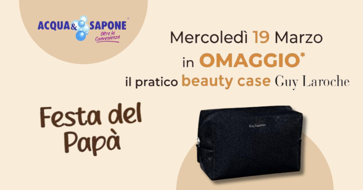 Per l’occasione, ma solo nella giornata del 19 marzo, effettua la tua spesa presso un negozio aderente Acqua & Sapone per ricevere in regalo il pratico beauty case Guy Laroche.