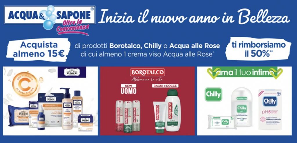 Partecipa all’attività di cashback Inizia il nuovo anno in bellezza: acquista almeno 15€ di prodotti Borotalco, Chilly e Acqua alle Rose in promozione e ricevi il rimborso del 50%, fino ad un importo massimo di 7,50€.