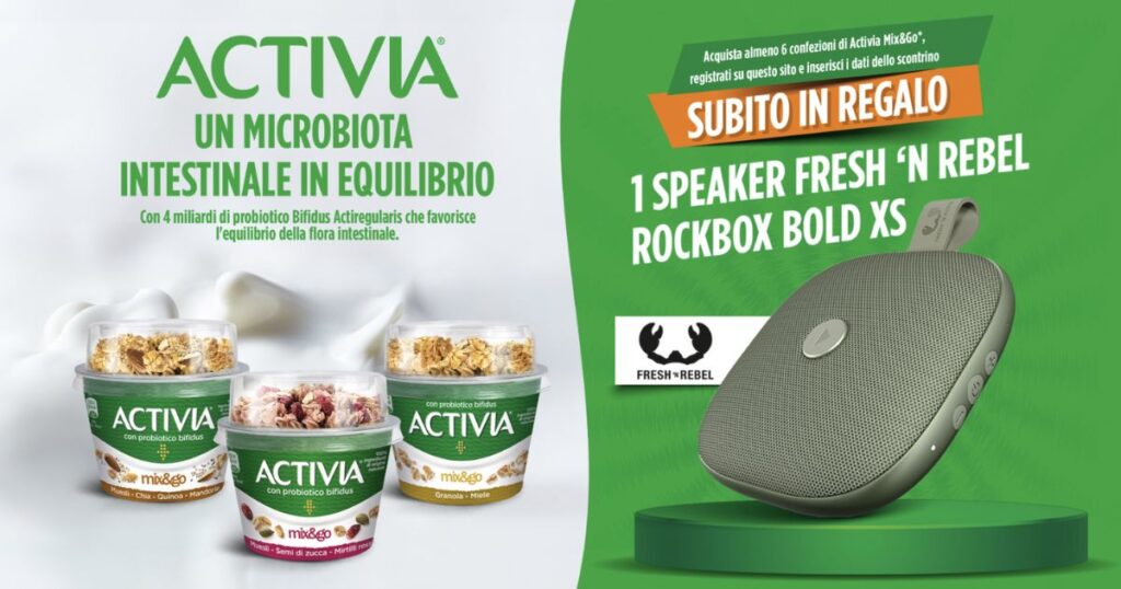 Non lasciarti sfuggire la nuova operazione a premi di Activia. Acquistando prodotti della linea Mix&Go, potrai richiedere uno speaker Fresh ‘n Rebel del valore di 34,99€ come premio certo.
