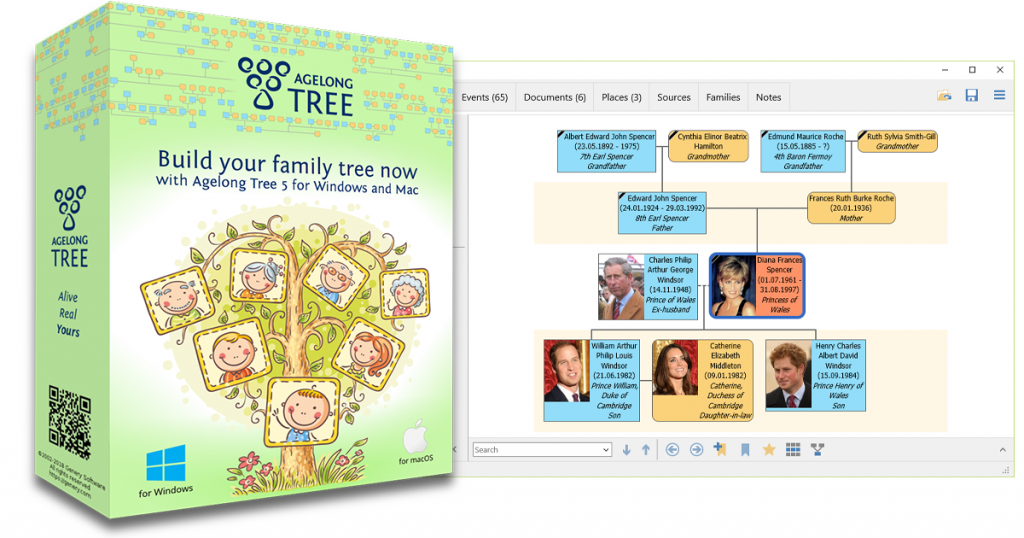 Agelong Tree è un software che permette di fare alberi genealogici in modo professionale ma adatto anche a principianti. L’albero genealogico viene costruito automaticamente utilizzando le informazioni sulle persone e gli eventi che collegano queste persone.