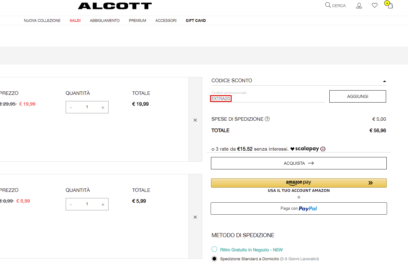 Una volta all’interno, clicca sulla scritta “CODICE SCONTO” e inserisci nell’apposito campo il codice EXTRA20, confermando su “AGGIUNGI”. Così facendo, il totale verrà scontato del 20%!