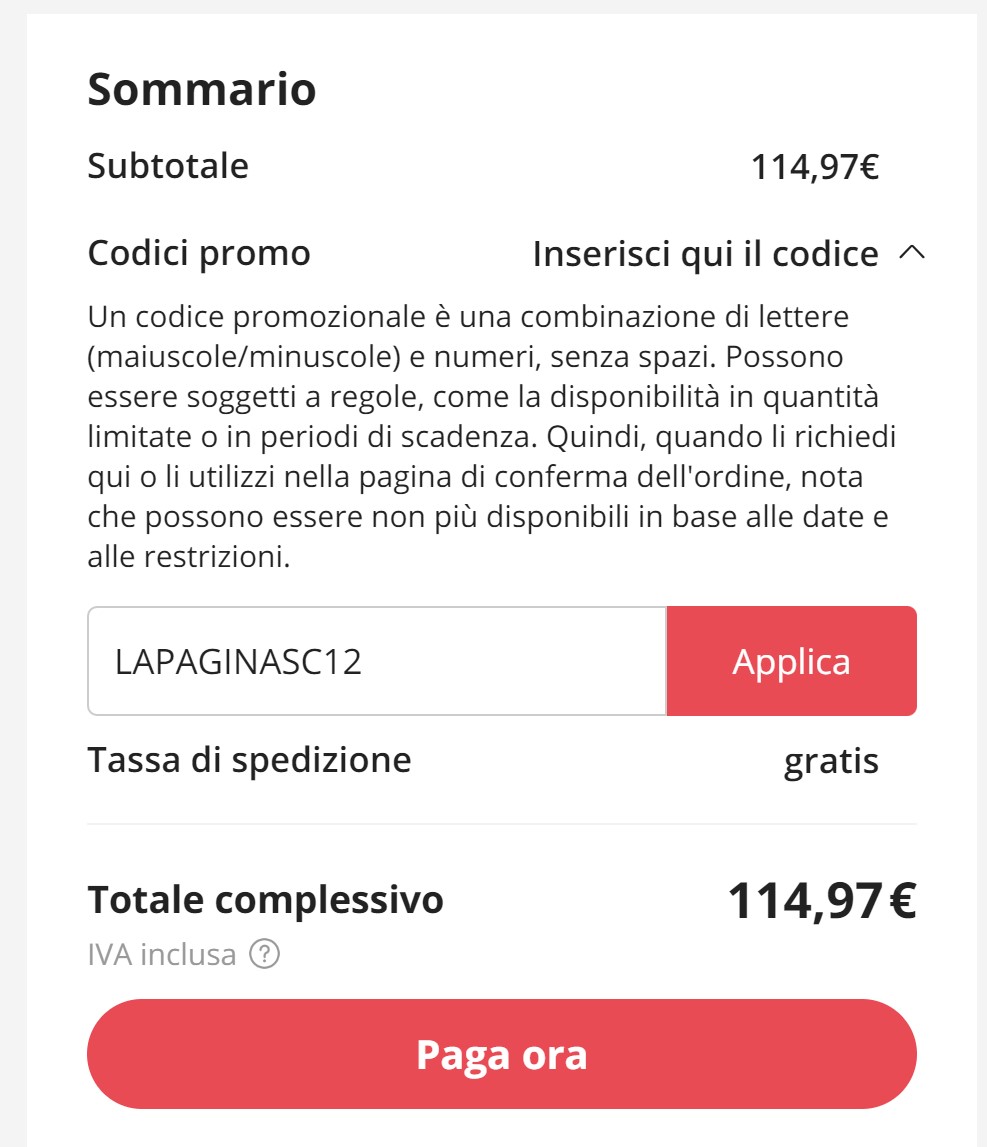 • LAPAGINASC12, sconto di 12€ con acquisto minimo di 89€;