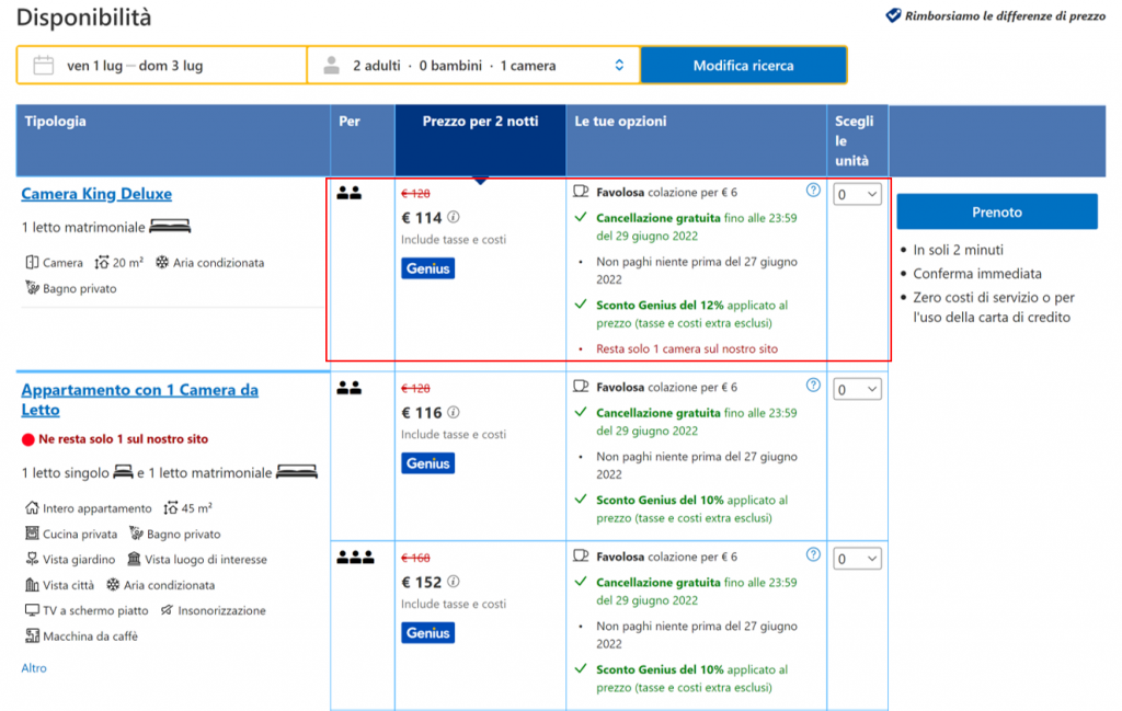 Esempio di offerta su Booking