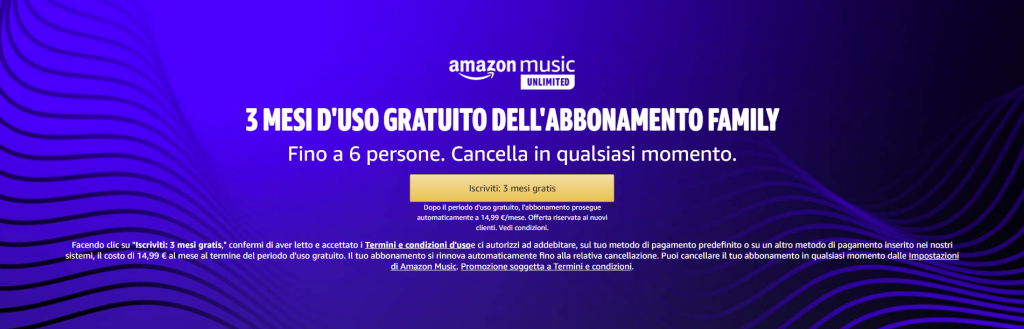 Se non hai mai provato il piano premium di Amazon Music, da oggi puoi richiedere i primi 3 mesi gratuiti di Unlimited Family, con cui potrai condividere il servizio con il resto della famiglia (massimo 6 membri).