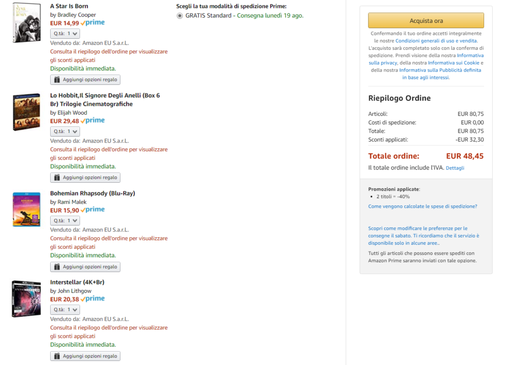 Come puoi vedere dall’immagine, con 4 titoli del valore di 80,75€ siamo riusciti a risparmiare ben 32,30€, ovvero il 40% totale!