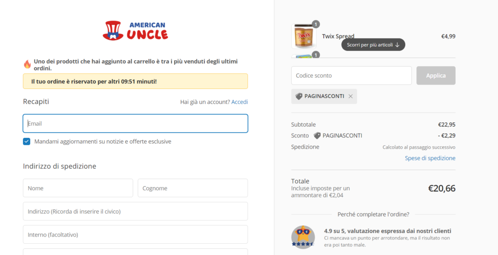 Per ottenere lo sconto, dovrai aggiungere i prodotti di tuo interesse al carrello, cliccare su Vai al checkout, ed inserire il codice PAGINASCONTI nel riquadroCodice sconto in alto a destra come mostrato nell’immagine sottostante.