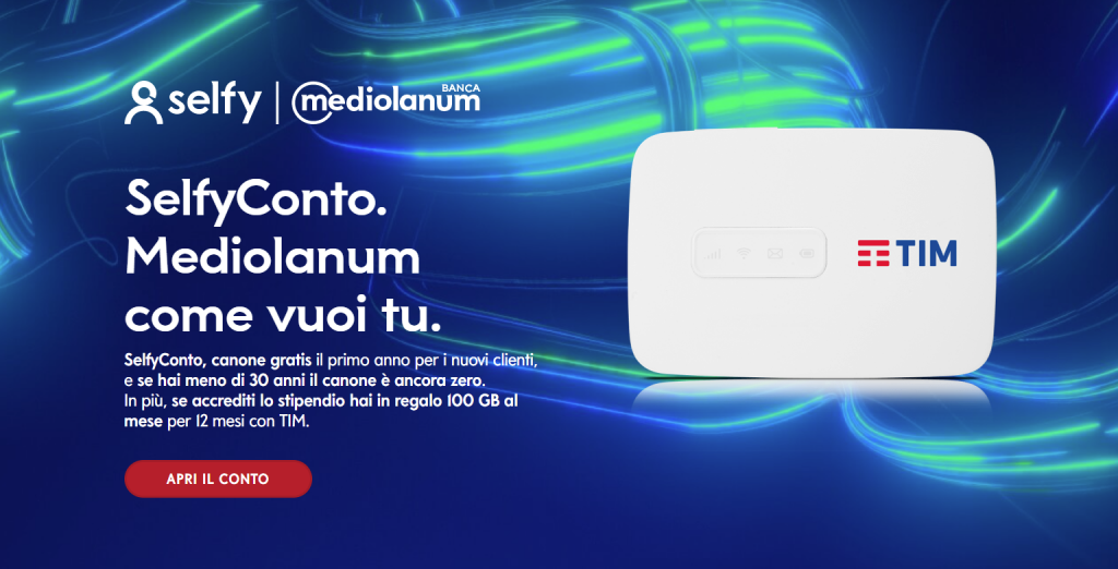 Banca Mediolanum presenta SelfyConto, il nuovo conto corrente tutto online che ti offre vantaggi unici con canone gratis per gli under 30 e per i nuovi iscritti, e ti aspetta anche uno splendido regalo di benvenuto!