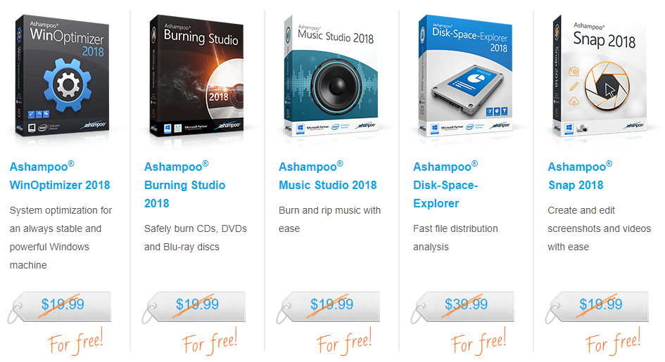 Ashampoo offre a tutti la possibilità di richiedere GRATIS ben 6 dei suoi software in versione completa! WinOptimizer 2018, Burning Studio 2018, Music Studio 2018, Disk-Space-Explorer, Snap 2018 e Privacy Protector saranno tuoi A COSTO ZERO (anziché pagarli circa 200€)!