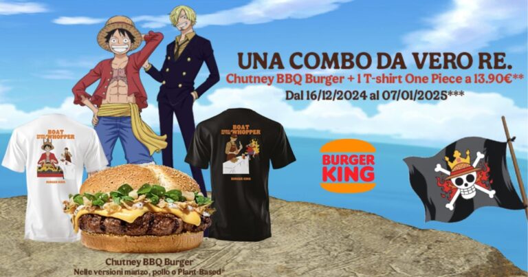 Fino al 7 gennaio, acquistando da Burger King un Chutney BBQ Burger di manzo, pollo o plant-based ottieni una t-shirt esclusiva di One Piece al prezzo unico di 13,90€!
