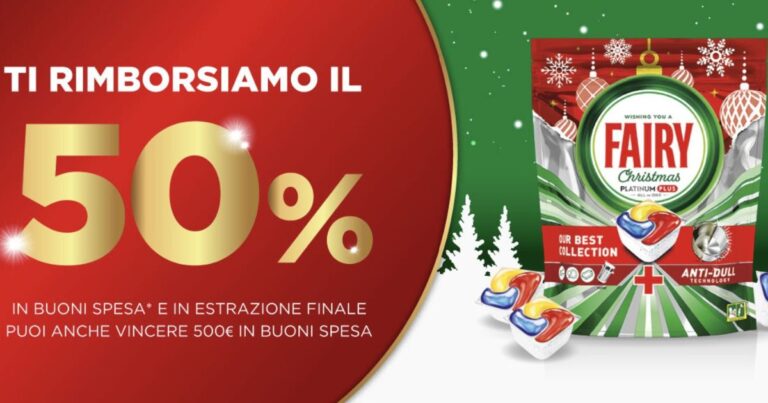 Acquista una confezione di Fairy Platinum Plus 53 CT Limited Edition e richiedi il cashback del 50% sotto forma di buoni spesa. Inoltre, puoi aggiudicarti un carnet da 500€ all'estrazione finale.
