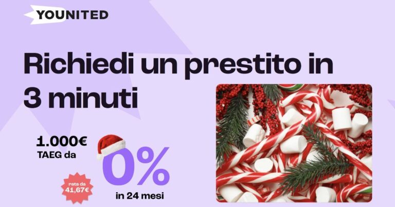 Non lasciarti sfuggire l'esclusiva offerta lampo natalizia di Younited Credit attiva solo oggi: i primi 30 nuovi clienti potranno ottenere prestiti fino a 1.000€, rimborsabili in 23 mensilità, con TAEG dallo 0%.