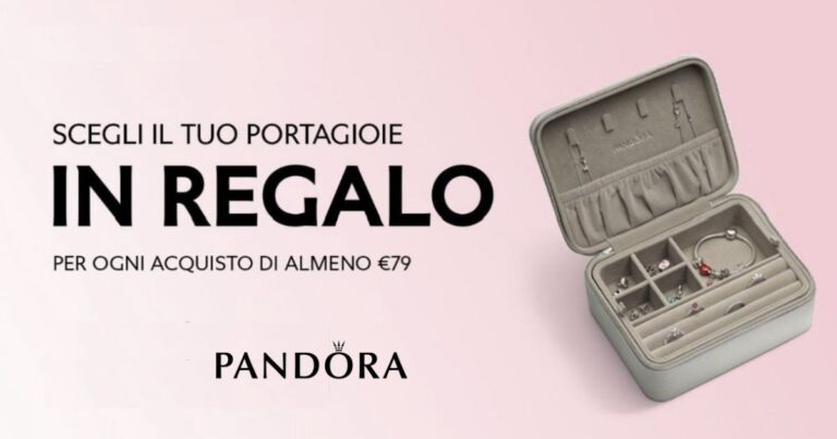 Approfitta della nuova promozione Pandora: con una spesa di almeno 79€ ricevi in omaggio un elegante portagioie a tua scelta.