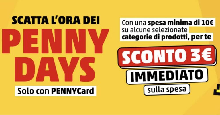 Da Penny Market stanno per tornare i Penny Days! Ottieni uno sconto di 3€ su una spesa di 10€ di alcune categorie selezionate di prodotti.