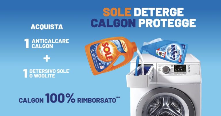 Acquistando 1 detersivo Woolite o Sole insieme a 1 anticalcare Calgon, puoi richiedere il rimborso completo di quest'ultimo, fino ad un massimo di 13,99€.