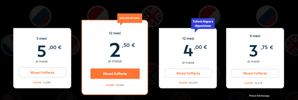 Se sceglierai infatti l’offerta da 4€ al mese per 12 mesi, avrai a disposizione già da subito tutte le lingue del catalogo, per soddisfare la tua curiosità e per iniziare ad apprendere più lingue!