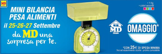 Nei giorni 25, 26 e 27 settembre 2019 da MD puoi ottenere l’esclusiva Mini Bilancia Pesa Alimenti in OMAGGIO!
