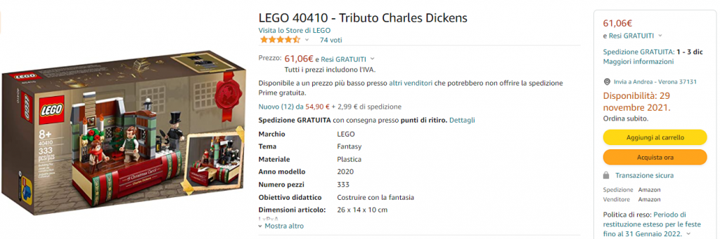 Il set è venduto su Amazon ad un prezzo di circa 60 euro, ed è di forte appeal tra i collezionisti: acquisterà ancora più valore visto che l’anno scorso era valutato da Lego Store sui 25 euro.