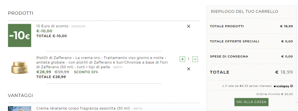 La Crema Oro, Trattamento per il Viso giorno e notte ai Pistilli di Zafferano (già scontata del 50%), costerebbero 28,99€. Invece si è applicato automaticamente lo sconto di 10€, e dal prezzo originale di 59,99€ paghi SOLO 18,99€!
