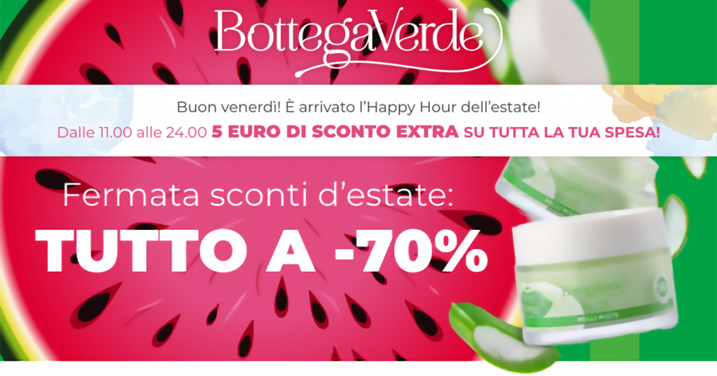 Arriva l’Happy Hour di Bottega Verde! Dalle 11:00 alle 23:59 di oggi 27 agosto, per te uno sconto extra di 5€ al carrello! E, per di più, lo Shampoo Argan Bottega Verde è in omaggio con ogni ordine!