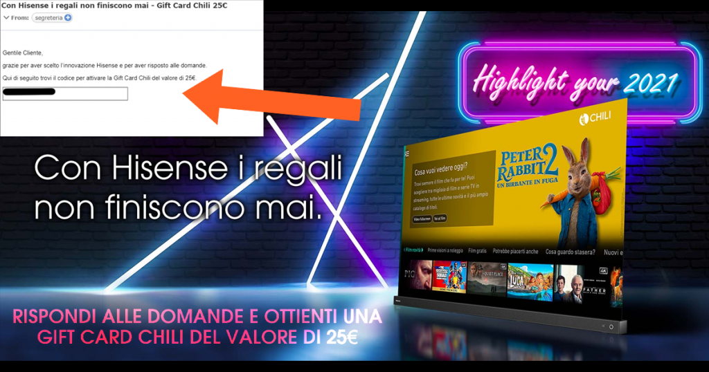 Nonostante un po’ di normale scetticismo iniziale, alla fine Hisense ha mantenuto le promesse e anche a noi sono arrivati i buoni da 25€ da spendere sulla piattaforma di noleggio in streaming Chili.