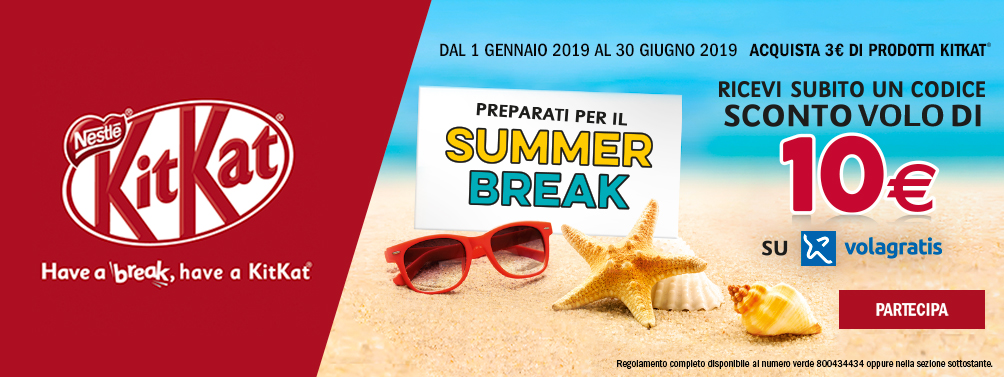 “Preparati per il Summer Break” è la nuova operazione con cui vincere come premio sicuro un buono da 10€ Volagratis, acquistando almeno 3€ di prodotti KitKat!
