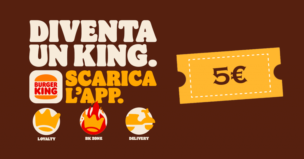 Effettua un ordine utilizzando l’app Burger King Italia e riceverai immediatamente uno sconto pari a 5€ sul totale!