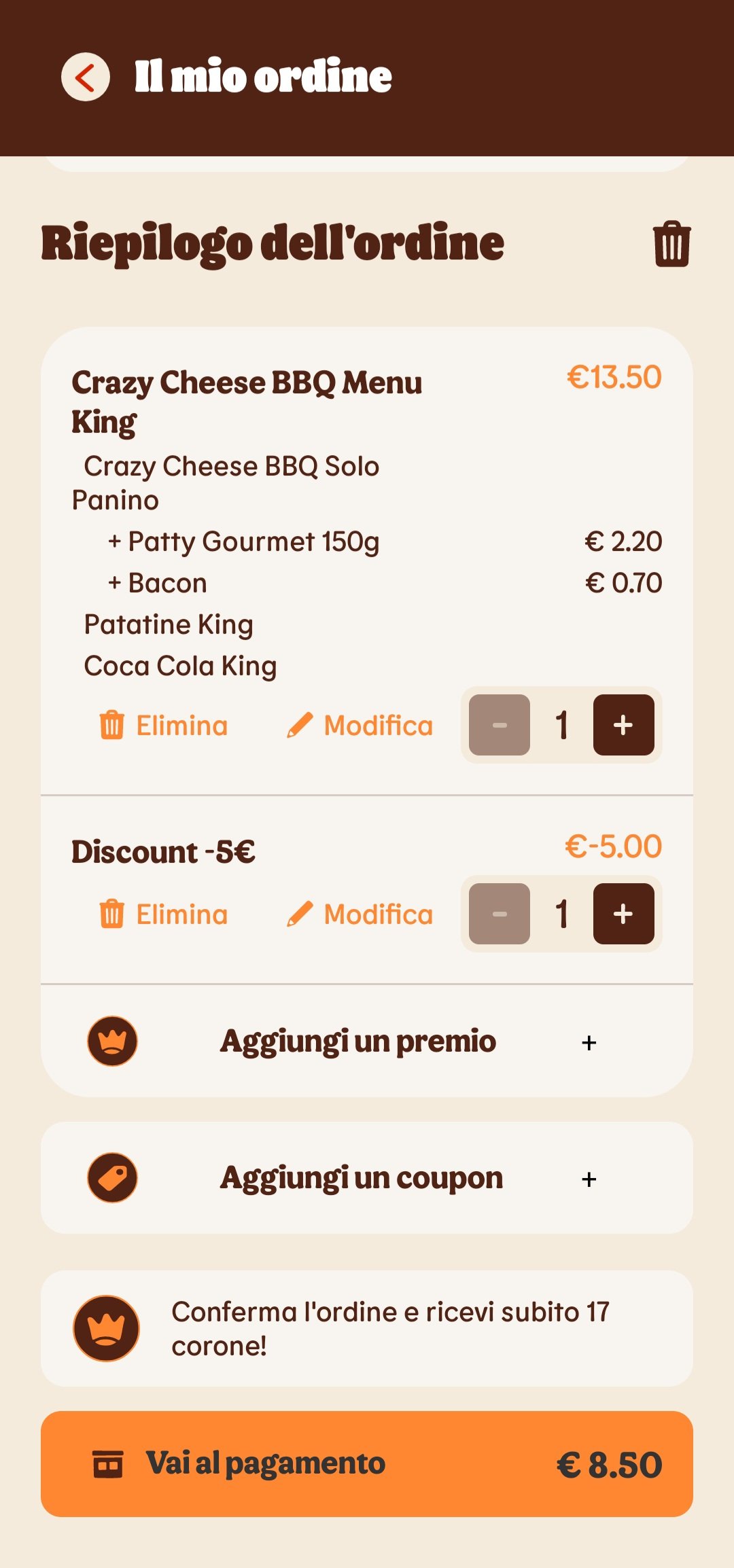 Effettua un ordine di almeno 13€ tramite l’app e, nel carrello, potrai notare lo sconto di 5€ automaticamente applicato! Completa dunque l’ordine per usufruire del coupon e gustare il tuo pasto!