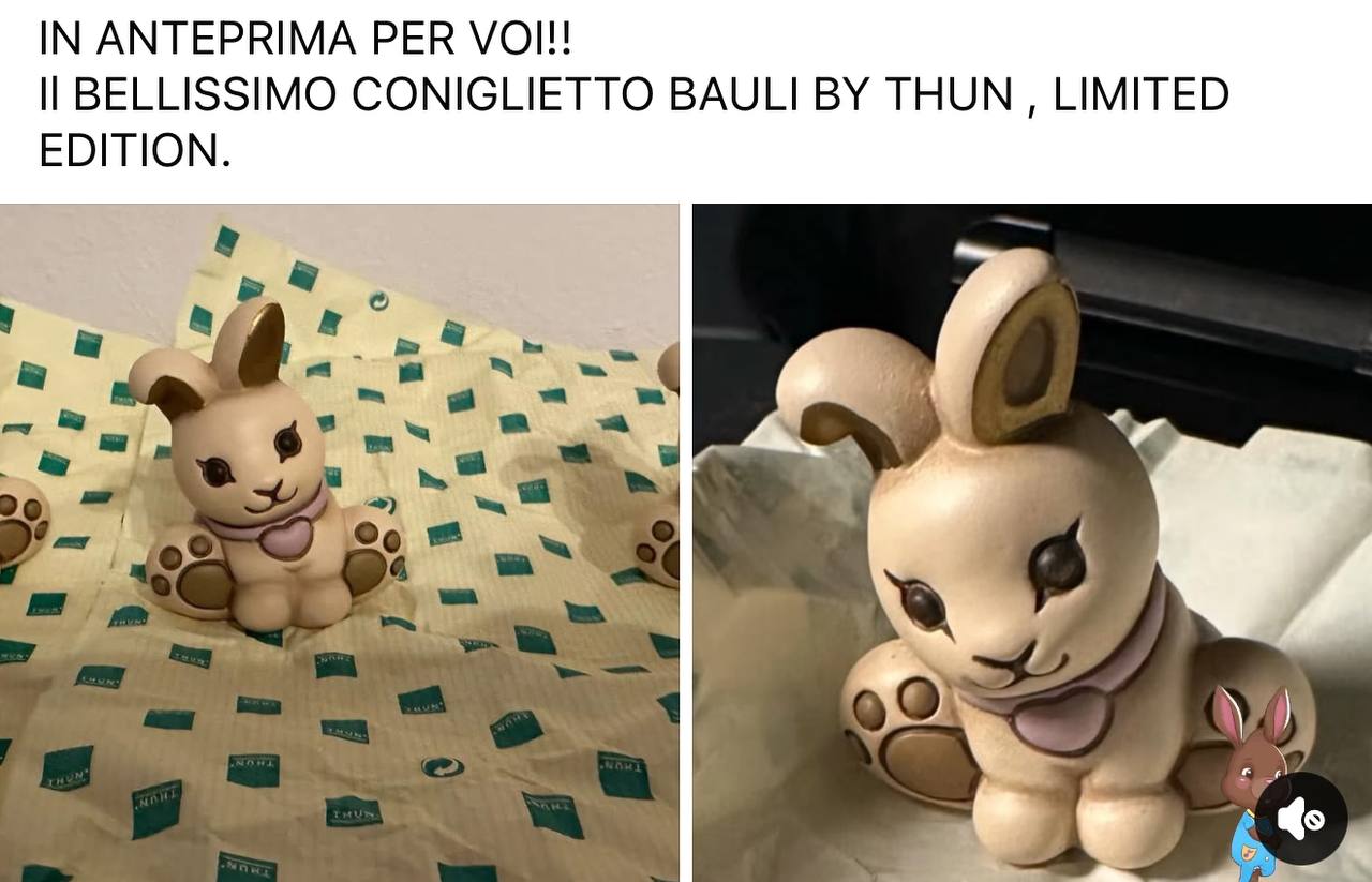 Anche quest’anno all’interno di alcune uova Bauli Grandi Firme si nasconde un coniglietto THUN, un oggetto da collezione che sta facendo impazzire tutti i fan del brand. La caccia al coniglietto, infatti, è diventata una vera e propria sfida che porta giornalmente adulti e bambini a pesare l’uovo prima di acquistarlo per conoscerne con certezza la sorpresa all’interno.