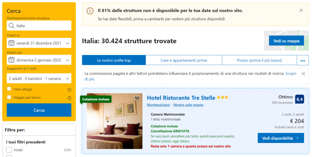 L’Hotel ha cancellazione gratuita e colazione inclusa al prezzo di 102 euro a testa in camera matrimoniale a Capodanno