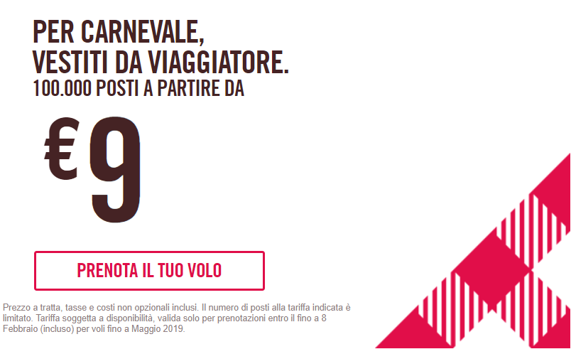 Ricorda che la promozione è valida solo per 100.000 posti aereo. Dunque è soggetta a disponibilità biglietti.