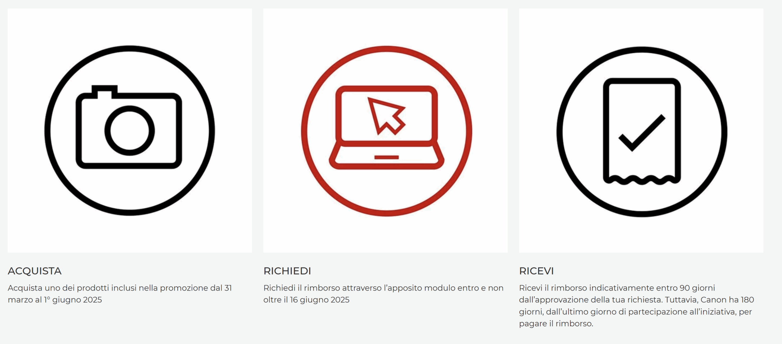 In base ai prodotti Canon che aderiscono alla promozione, acquistati entro il 1° giugno 2025, avrai diritto a un importo diverso di rimborso. Nello specifico: