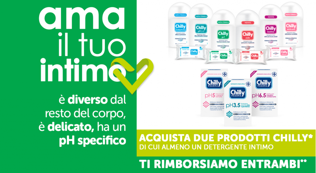 Acquista almeno 2 prodotti aderenti a marchio Chilly, di cui almeno un detergente intimo, per ottenere il rimborso completo di entrambi. L’ammontare massimo di cashback è pari a 10,78€.