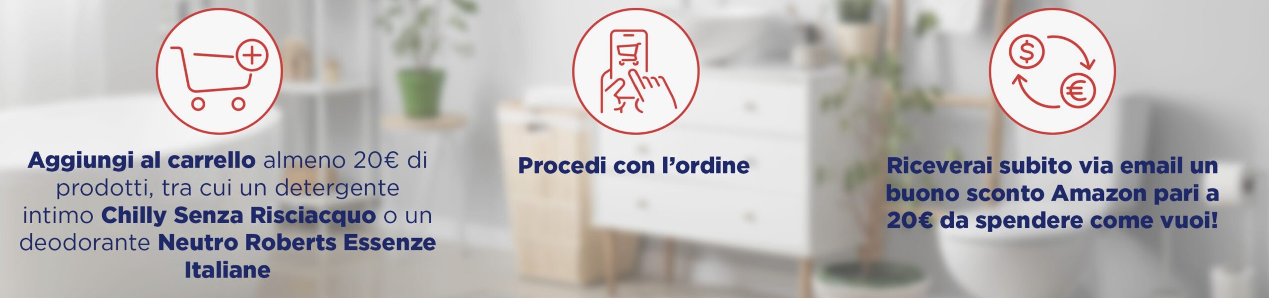 Acquista su Amazon, in un unico ordine, almeno 20€ di prodotti a marchio Neutro Roberts, Borotalco, Chilly, Omia, Acqua alle Rose (consultabili nello specifico all’interno della Tabella B presente in fondo alla pagina web dedicata all’iniziativa), di cui obbligatoriamente almeno 1 articolo a scelta tra: