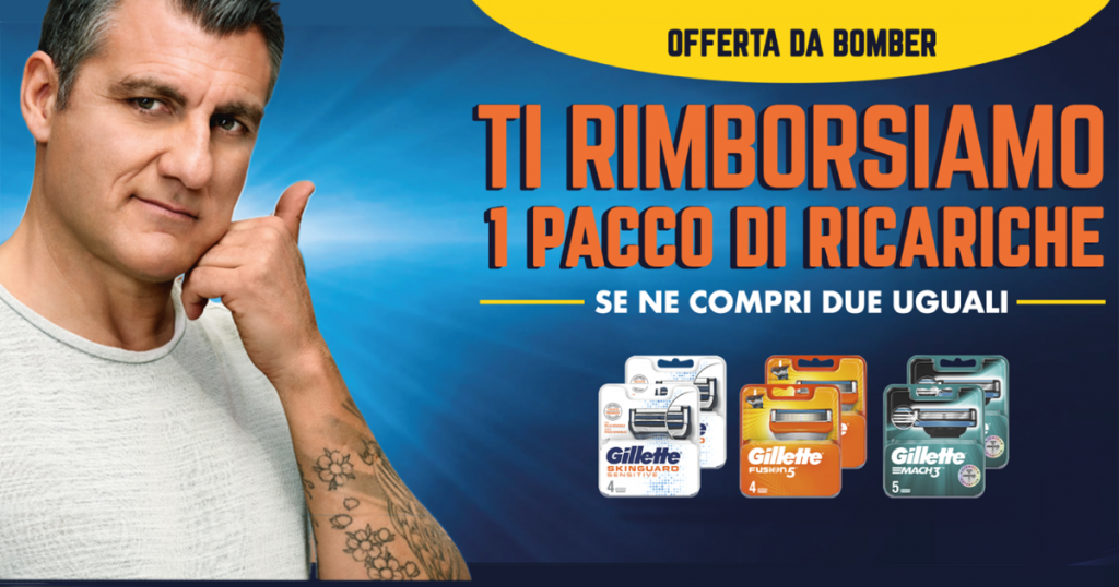 Fino al 28 febbraio, in tutti i punti di vendita, acquistando due confezioni di ricariche delle lame Gillette, potrai partecipare al Cashback, ottenendo il completo rimborso della seconda confezione.