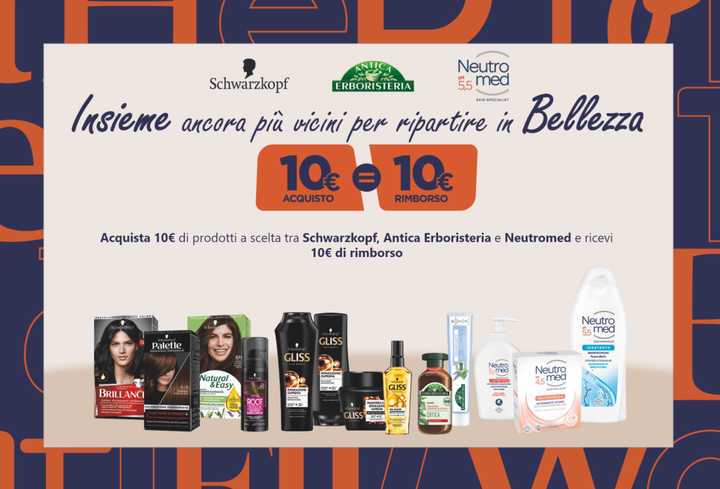 Per partecipare all’iniziativa è richiesto un acquisto di almeno 10,00€ di prodotti a scelta tra Schwarzkopf, Antica Erboristeria e Neutromed.