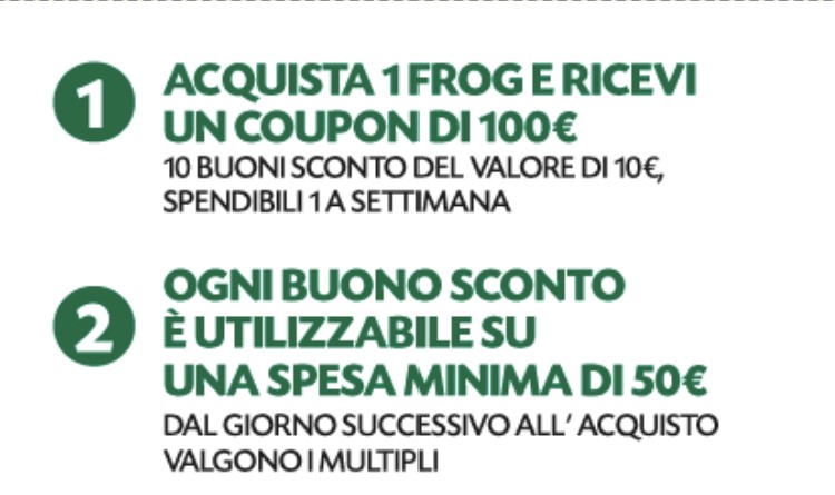 Una volta in cassa, scansiona la tua Carta fedeltà e otterrai un coupon del valore complessivo di 100€, composto da 10 buoni spesa da 10€. Potrai utilizzarne uno a settimana su una spesa minima di 50€ a partire dal giorno successivo all’acquisto.