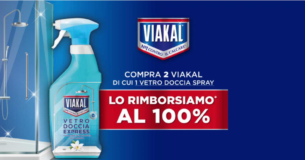 Nello specifico, ti verrà rimborsato il costo per l’acquisto di Viakal Doccia Spray per un importo massimo di 3,99€ (l’altro prodotto quindi resterà a carico tuo).