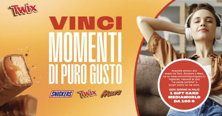 “Vinci momenti di puro gusto” con il nuovo concorso Twix! Acquistando 2 golosi snack e rispondendo a un rapido quiz, puoi vincere ogni giorno 1 gift card MediaWorld da 100€. Ecco nel dettaglio come partecipare. Requisiti di partecipazione Acquista, in…