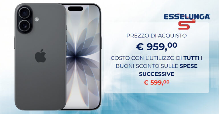 Solo fino al 14 dicembre, acquistando un iPhone 17 da 256GB a 959€ nei punti vendita Esselunga, ottieni 360€ di cashback in buoni spesa.