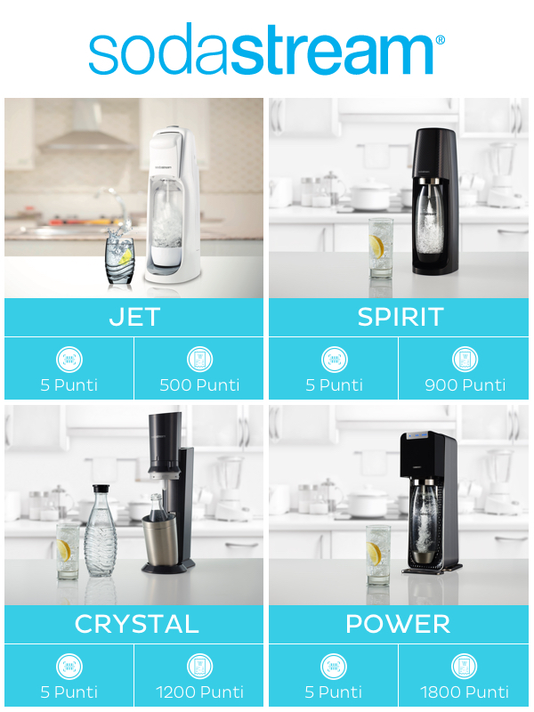 SodaStream (5 punti scan, modello Jet 500 punti ad acquisto, Spirit 900 punti, Crystal 1200 punti e Power 1800 punti);