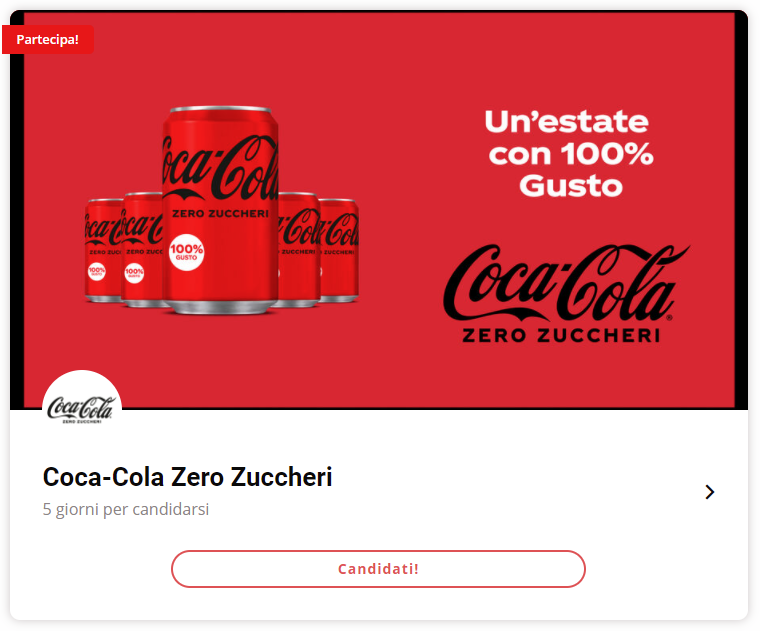 Riaprono le candidature di Trnd per testare i prodotti Coca Cola Zero Zuccheri! Fino al 2 agosto 2021, potrai candidarti per ricevere gratis 5 lattine da 150ml!
